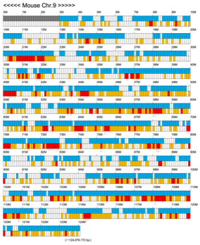 Using the Mouse Genome Browser, the chromoexcel represents the number of genes and gene trap clones for every 100 kbp of chromosome. If there is even one gene, it is light blue; if not, it is colorless. Gaps (locations with no nucleotide sequence information) are shown in gray. Trap clones are colorless if there are no clones, orange if there are 1 to 19 clones, and red if there are 20 or more clones. Regions with genes but no gene trap clones indicate that the gene is not working in the ES cells. Conversely, a region with no genes but many gene trap clones suggest the presence of a gene or gene-like substance that we do not yet know about. See "About" for a detailed explanation.